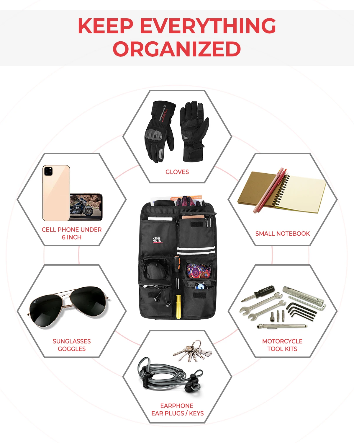 • Material Durável: Fabricado com materiais de alta qualidade, o organizador é resistente ao desgaste e projetado para suportar as demandas das viagens de motocicleta, garantindo que seus itens protegidos e organizados sejam protegidos.
